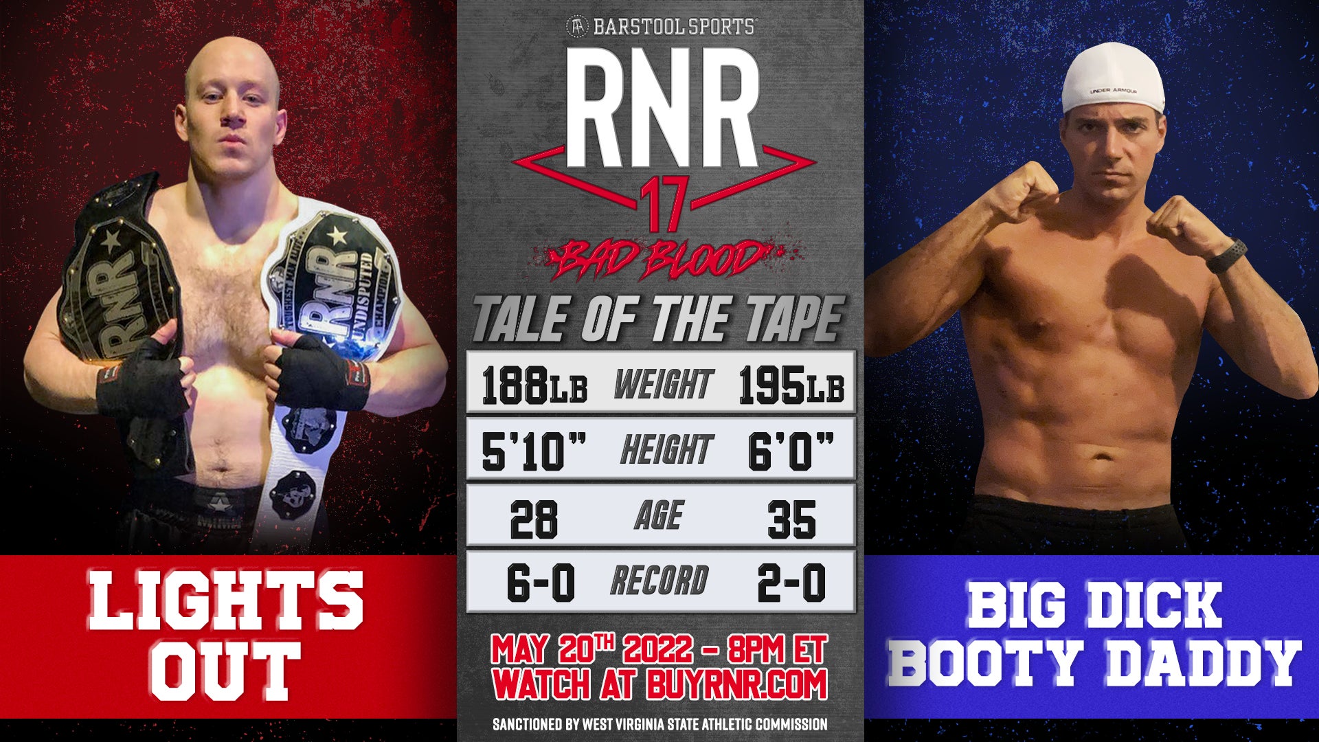 (2-0) BIG DICK BOOTY DADDY vs (6-0) LIGHTS OUT LAING, our heavyweight champion of Rough N' Rowdy and pride of The South Shore of Massachusetts.